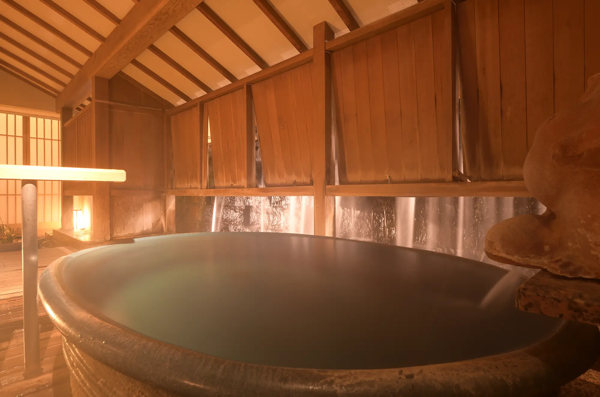 名水と名高い、ブナ原生林の湧水が川になった深沢川から取水された磐梯熱海温泉の名水を信楽焼の水風呂で、身体で感じて頂けます。柔らかな肌当たりです。