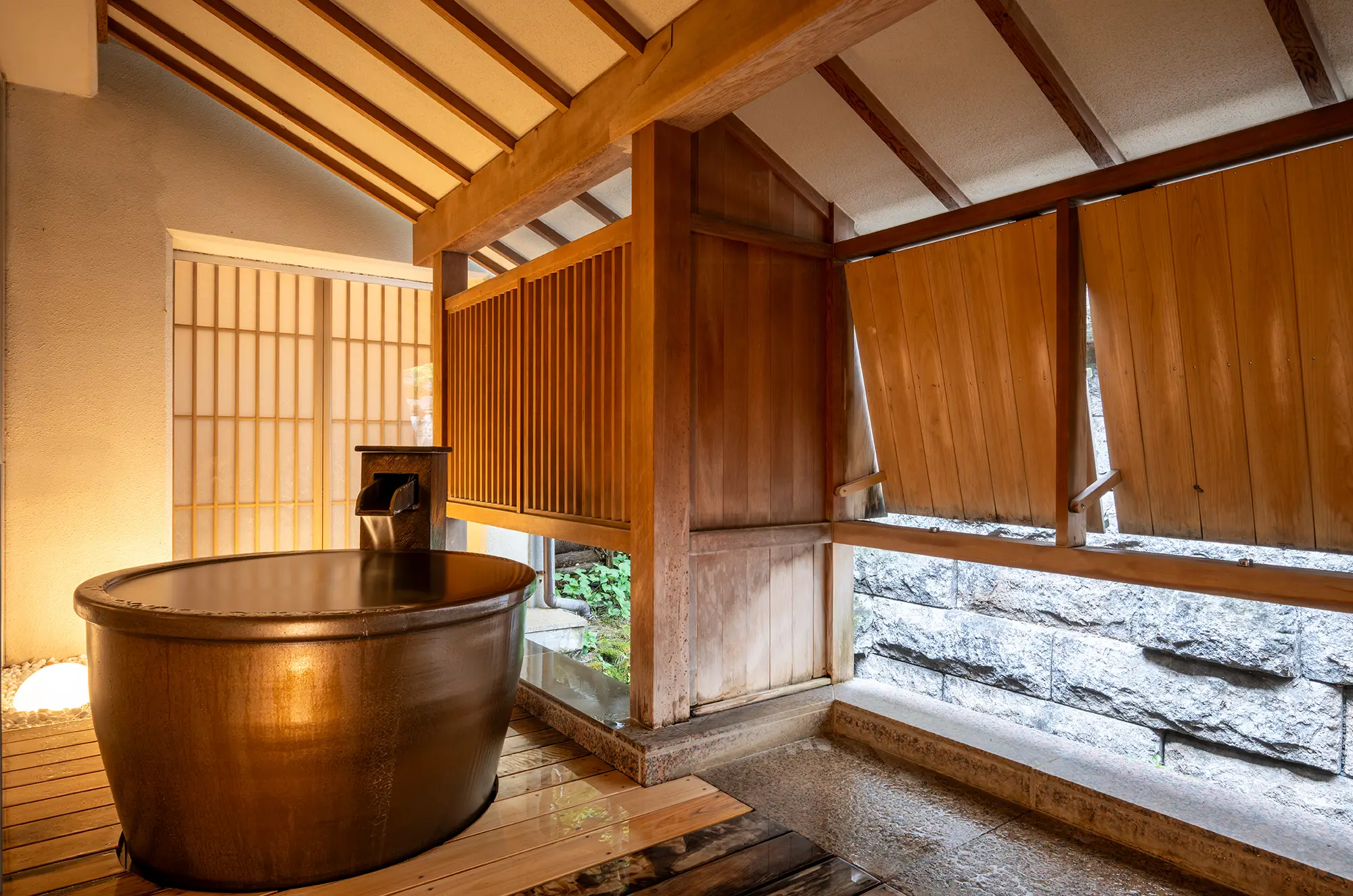 四季ごと表情を変える山々を眺められる2つの浴槽で